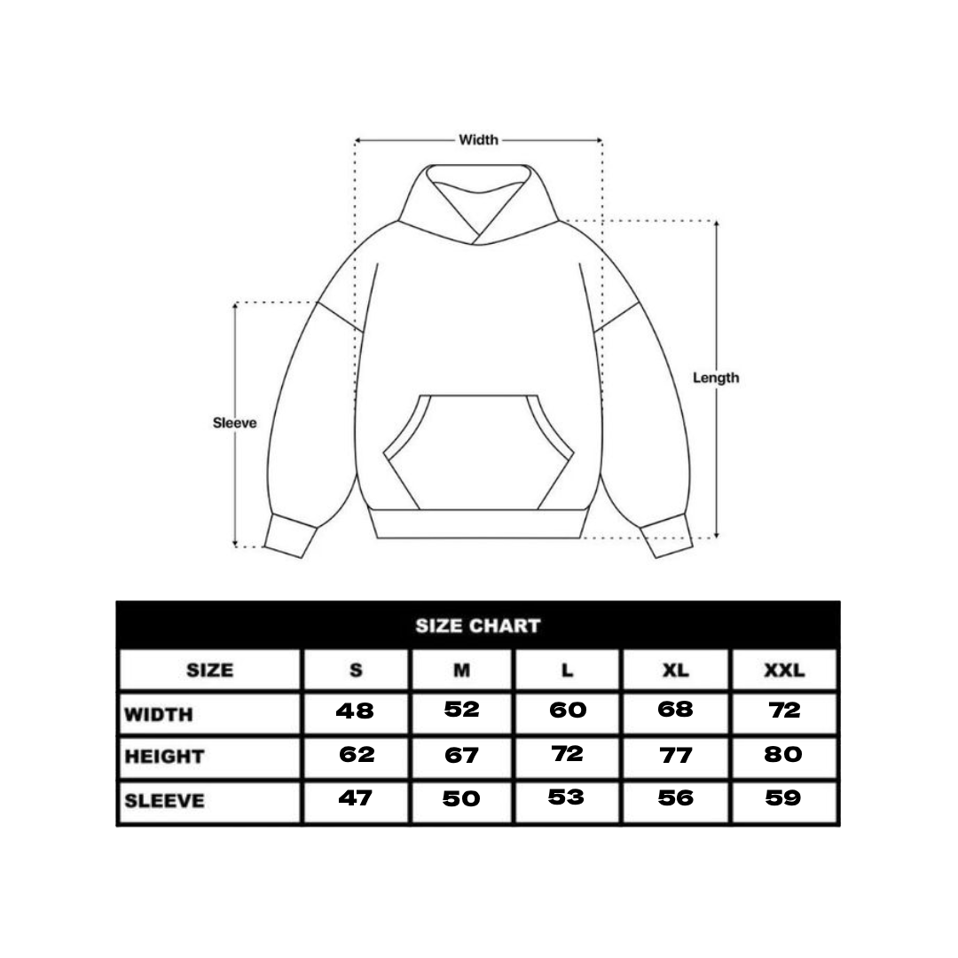 Our size chart shows the width, height, and sleeve length for each hoodie size, helping you choose the fit that suits you best.